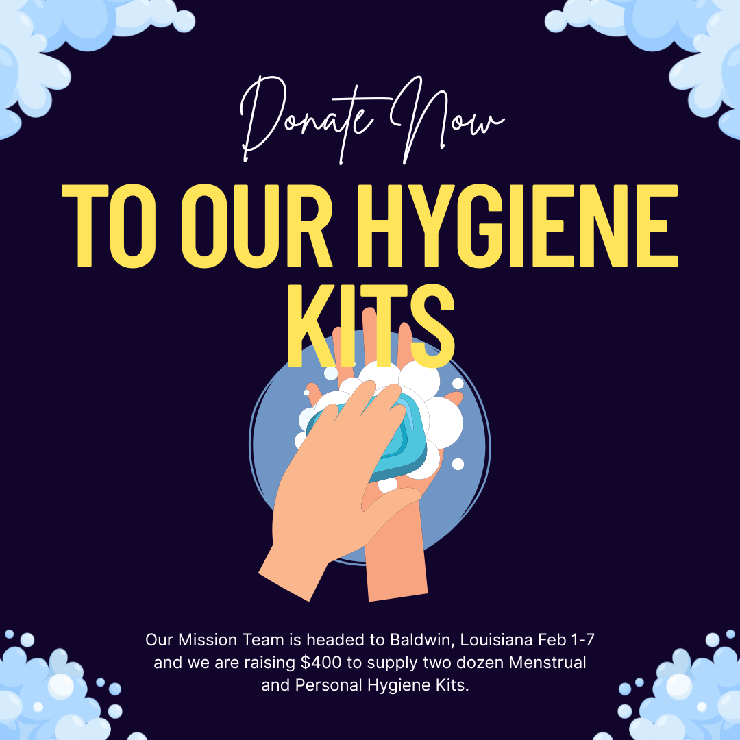 Our mission team will be serving in Baldwin, Louisiana, from February 1 to 7. We need $400 to purchase 24 menstrual and hygiene kits to support local women and families.